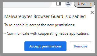 After updating to the latest version of Browser Guard for Chrome or Edge, an error message appears in the top right corner of your browser. When clicked, it displays the message: Malwarebytes Browser Guard is disabled.