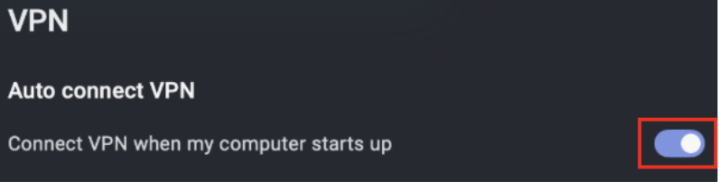 Your computer now automatically connects to the VPN when you power it on. To turn off this setting, return to the VPN settings page and toggle it Off.