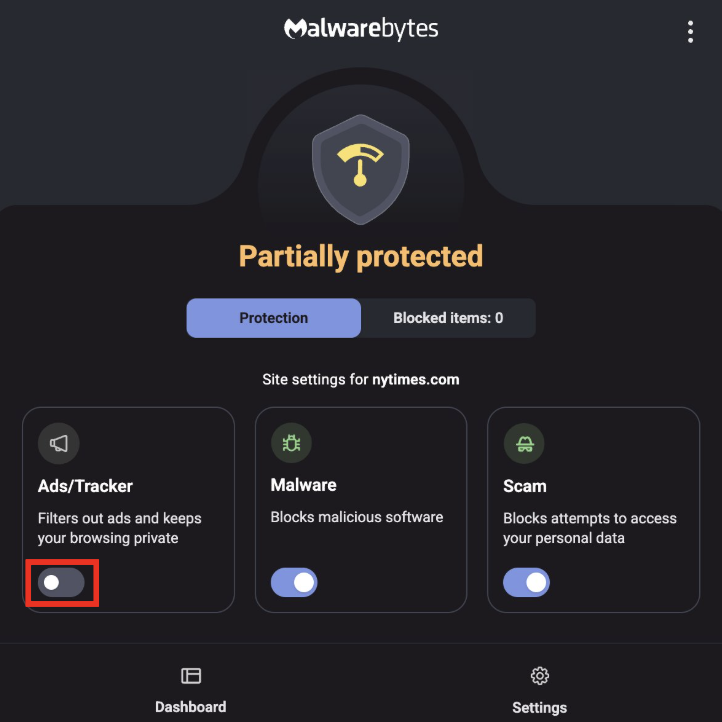 - On the main dashboard, toggle off Ads/Tracker.